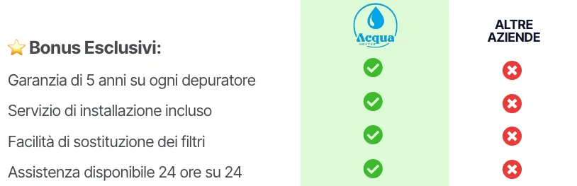 Con Acqua Doctor puoi avere una sorgente di acqua pura illimitata a casa tua, adatta sia per bere che per cucinare, con una spesa di poco più di 1 € al giorno. Questo include 5 anni di full assistenza, comprensiva di cambio filtri, manutenzione, assistenza e garanzia.
